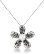 Tori Hill® Genuine Marcasite and Crystal Large Flower Pendant with Perfectly Round Simulated Pearl, 18" Chain-Sterling Silver
