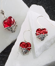 Tori Hill® Genuine Marcasite and Simulated Ruby Filigree Heart Dangle Earrings-Sterling Silver