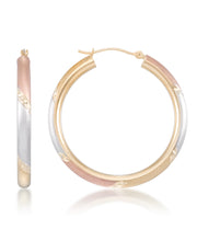 Graduated Tri Color Round Hoop Earrings with Satin and Diamond Cut in 14K Yellow, Rose and White Gold over Sterling Silver-Tri-Color